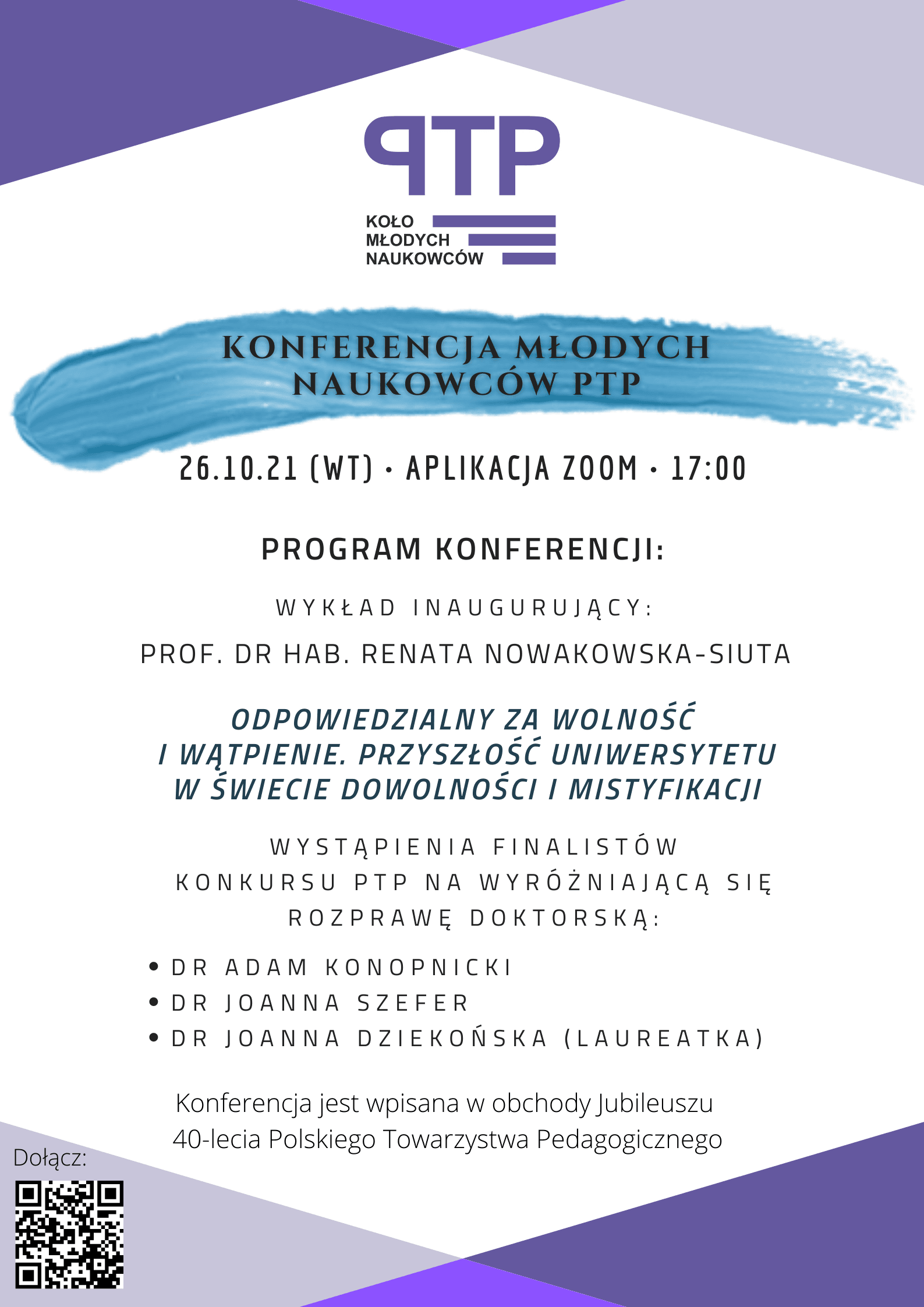 Konferencja odbędzie się 26.10.2021 r. (wtorek) o godzinie 17.00 z wykorzystaniem aplikacji ZOOM. Konferencja jest wpisana w obchody Jubileuszu 40-lecia Polskiego Towarzystwa Pedagogicznego.